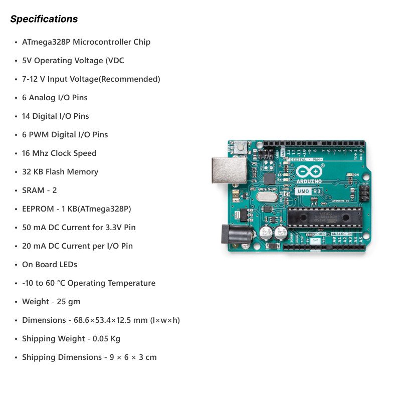 The Official Arduino Uno Rev3 (A000066) is a robust 8‑bit microcontroller board powered by the ATmega328P, running at 16 MHz. It includes 14 digital I/O pins (6 PWM), 6 analog inputs, 32 KB flash (0.5 KB used by bootloader), 2 KB SRAM, 1 KB EEPROM, USB‑B port, power jack, ICSP header, designed for easy prototyping and education